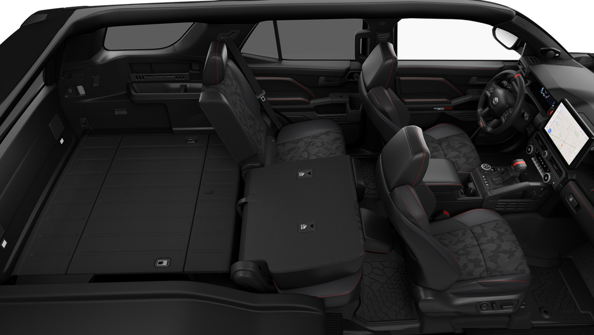 - Gloss-black "TOYOTA" heritage grille, mirror caps, door handles, overfenders and rear spoiler; "TRD PRO" hood badge and stamped liftgate